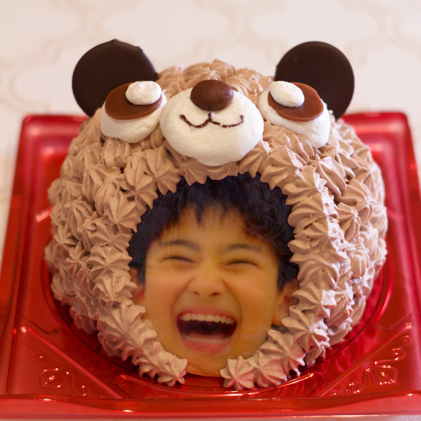 クマのかぶり物をイメージしたケーキ。お子様のお顔を印刷してキュートなクマさんに変身!